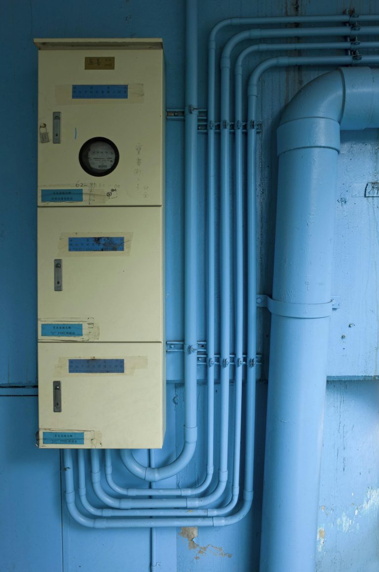 a-close-up-view-of-an-industrial-electric-distribution-board-with-blue-pipes-...