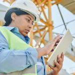 a-female-engineer-in-workwear-checks-her-tablet-on-a-construction-site-highli...
